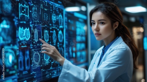 Female doctor meticulously analyzes physiological data displayed on a digital screen in a high-tech lab, showcasing advanced medical research and innovative technology.