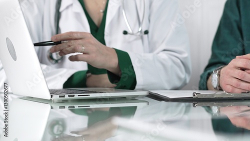 Female doctor showing medical exam results on a laptop to a patient during a visit at the clinic, healthcare and medical consultation concept