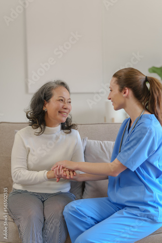 Female doctor taking a history of a patient and counseling on orthopedic diseases with female patients after measuring blood pressure and heart rate in a medical facility