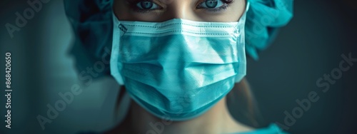 Female doctor wearing a mask looking at the camera on a blurred background.