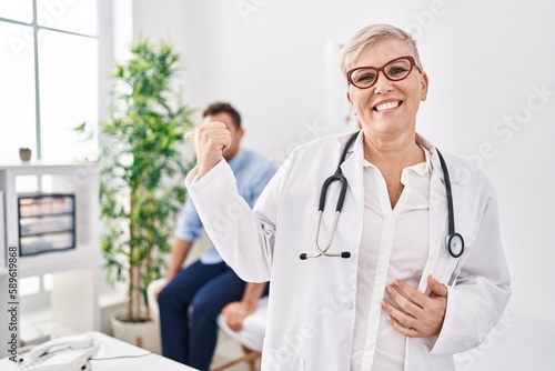 Female doctor wearing uniform and stethoscope at medical clinic pointing thumb up to the side smiling happy with open mouth