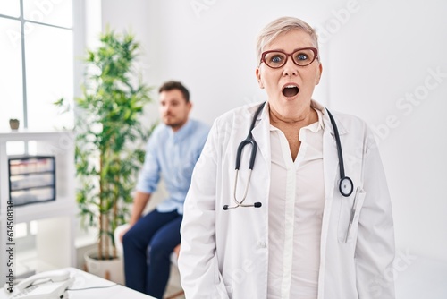 Female doctor wearing uniform and stethoscope at medical clinic scared and amazed with open mouth for surprise, disbelief face