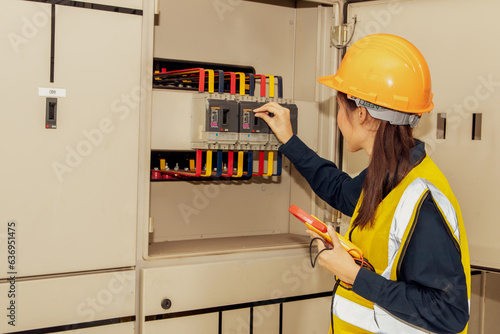 Female electrician electronic worker inspecting control panel electrical control panel in machine control room ON breaker control cabinet three phase 380v electrical system with confidence.
