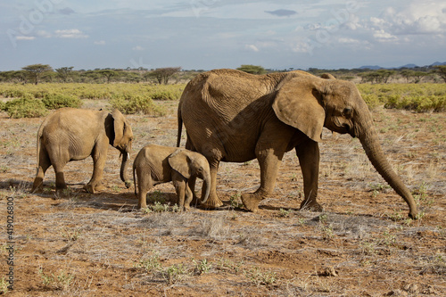 Female elephant with two calves, Samburu Game Reserve, Kenya