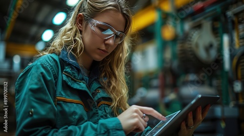 Female Engineer Inspecting Machinery with Digital Tablet in Modern Factory