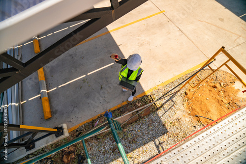Female engineer inspects solar panels under a carport with a laptop and infrared thermometer. Focus on clean energy, solar efficiency, and sustainable infrastructure development for parking areas.