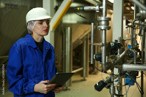 female engineer is holding tablet and conducting an inspection in a production hall at a food factory