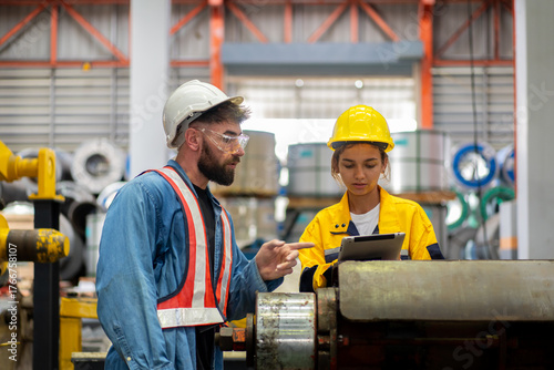 female engineer supervisor advice technician foreman to inspect and check spare part equipment of production machine, team of diverse workers working together at industrial manufacturing factory