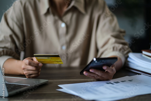 Female entrepreneur hold credit card to shopping online on smartphone and working about new startup