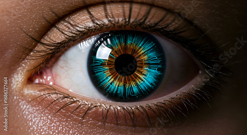 Female eye with vibrant teal and brown contact lens featuring circuit board design. Close-up view of eye detail. Female model, professional digital art artist, studio.