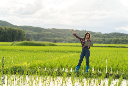 Female farmer using tablet at close range to collect data at the rice fields in the evening with warm light Agriculture concept, technology concept
