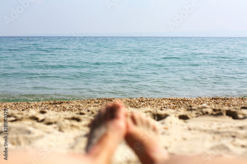 Female feet, sandy beach and sea in the background. Picture with soft focus and place for your text. summer concept. Enjoying the sea or ocean. Focus is on the sea. Vacation holidays. Copy space.