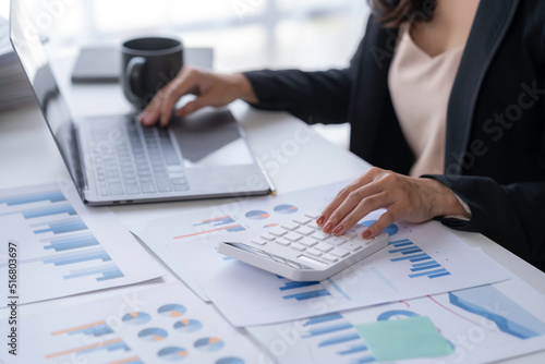 Female finance staff is calculating by using a calculator. Investment results to report to his boss at the meeting. On the table in the office, the concept of calculating investment results