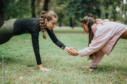 Female fitness enthusiasts engaged in an interactive push-up exercise in a park. Health and teamwork.