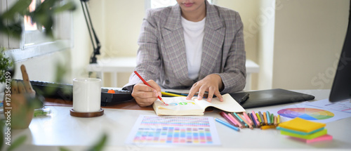Female graphic designer sketching logo concepts with colored pencils in a notebook