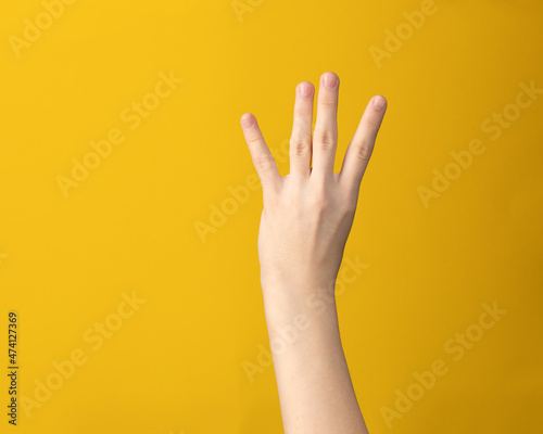 Female hand gesture on yellow background. Woman hand isolated showing index, middle, ring and little four fingers.