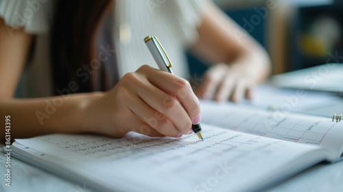 Female hand holding a pen, marking a date on a calendar