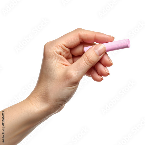 Female Hand Holding A Pink Chalk Stick isolated on transparent background. PNG die-cut for advertising