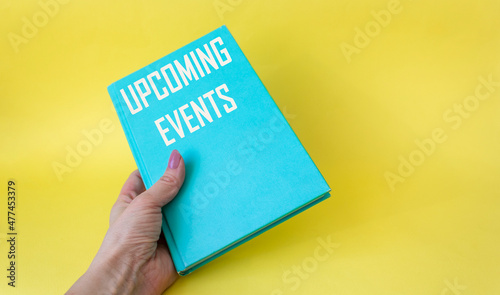 Female hand holding green diary with text sign showing upcoming events on yellow background.Conceptual photo of upcoming planned public or social events