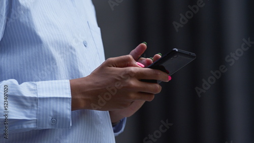 Female hand holding phone swiping closeup. Young application user check messages