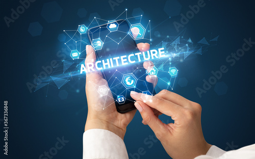 Female hand holding smartphone with ARCHITECTURE inscription, modern technology concept