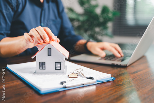 Female hand holds small miniature toy house, symbolizing woman dream of moving into her own home-real estate concept represents property investment, mortgage planning, insurance for secure future.