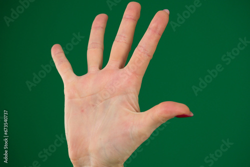 female hand isolated body parts of young woman on a green background palm chroma key