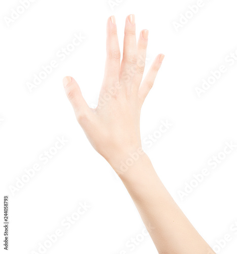 Female hand isolated on white background. White woman's hand showing symbols and gestures. Relaxed hand