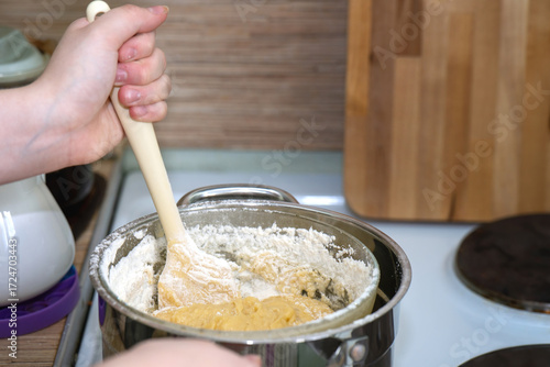 Female hand mixing thick honey dessert dough in a pot with a silicone spatula