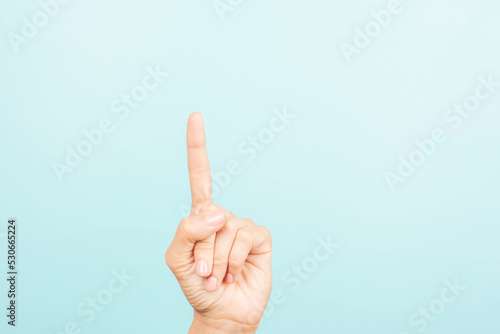 Female hand shows number one. Woman pointing up with index finger on light blue background