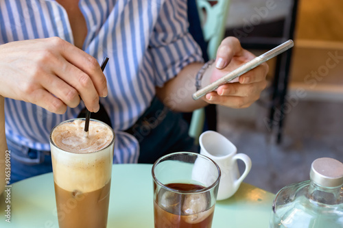 Female hand stirring a straw on a greek cold coffee, freddo cappuccino while looking a mobile, coffee break concept.