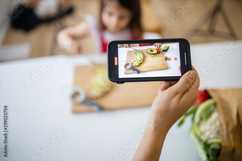 Female hand with a smartphone recording a little girl cutting an avocado