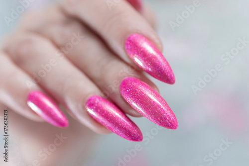 Female hand with long nails and a bottle bright neon pink fuchsia color nail polish