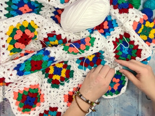 Female hands and crocheting process granny square blanket making with clews of yarn and cozy home photo