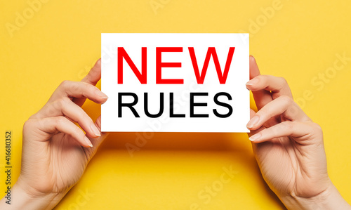Female hands hold card paper with text new rules on a yellow background. Business and finance concept