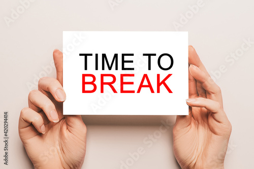Female hands hold card paper with text TIME TO BREAK on a yellow background. Business and finance concept