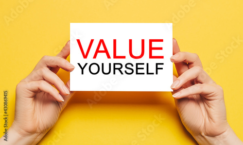 Female hands hold card paper with text value yourself on a yellow background. Business and finance concept