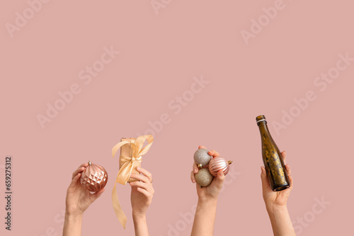 Female hands holding Christmas balls, bottle of champagne and gift box on pink background