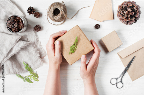 Female hands holding the craft gift box with branch