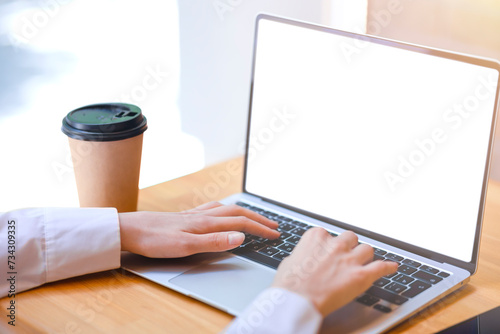 Female hands in white shirt typing on laptop, white screen, empty space. Close-up photo of hands, laptop on wooden table, glass with hot drink, business, freelancing, study
