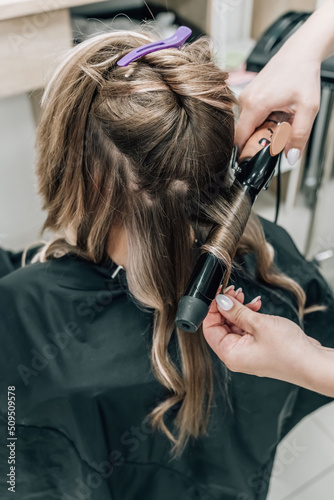 Female hands of a hair master. Close-up of blond hair on a curling iron. Curling curls.