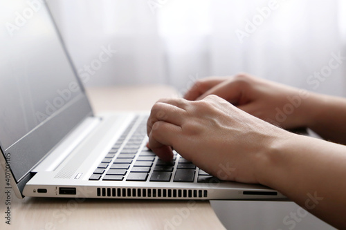 Female hands on laptop keyboard on a desk in sunlight. Woman types on the laptop keyboard sitting near the window, office or home work