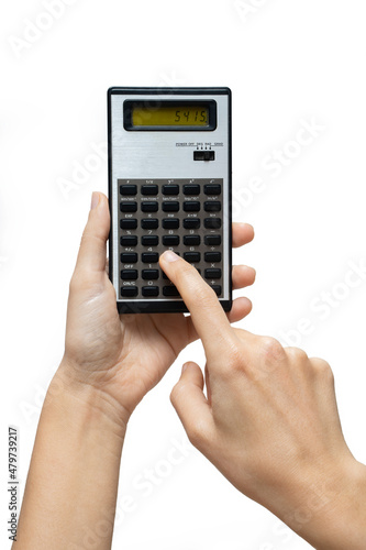 Female Hands Using A Vintage Scientific Calculator, Isolated On White Background
