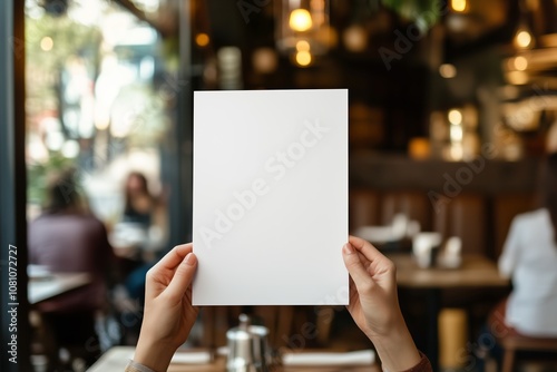 Female hands with blank menu on blurred cafe interior