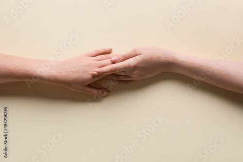Female hands with drawing of hearts and lines on color background. Donation concept