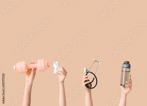 Female hands with dumbbell, light blue ribbon, stethoscope and water bottle on beige background. Prostate cancer concept
