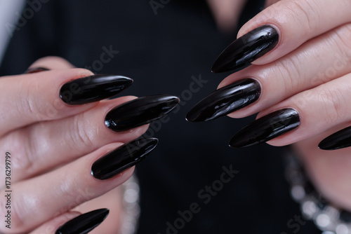 Female hands with long nails and black nail polish