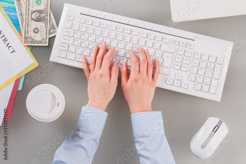 Female hands working on computer, top view. Business woman hands typing on computer keyboard at office desk.