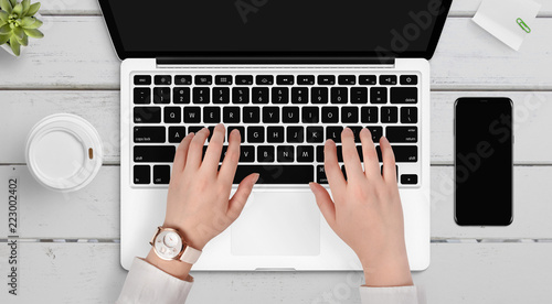 Female hands working on modern laptop at the white wooden desk surrounded with phone, coffee, plant and note paper