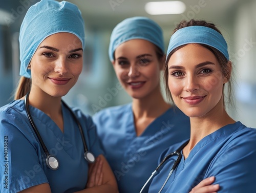 Female healthcare workers in scrubs, working together in a hospital setting, highlighting teamwork and care, Women in healthcare, Workforce equality